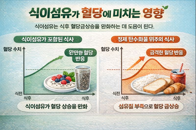 치아씨드가 혈당 관리와 연결되는 가장 큰 이유는 식이섬유의 밀도 때문이다. 식이섬유는 탄수화물의 소화와 흡수 속도를 늦추는 방향으로 작동할 수 있어, 식후 혈당 상승 곡선을 완만하게 만드는 데 기여할 가능성이 있다.